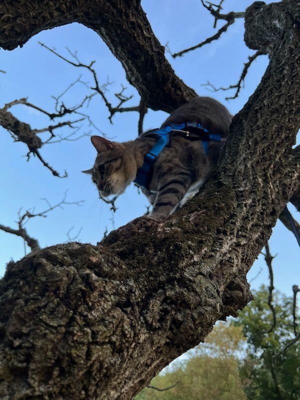 He loved to walk through the park trails and smell all of the plants. He also loved to sit on my lap during car rides where-ever we went. He was very social for being a cat. He would visit the neighbor cats for play dates when he was feeling social. He brushed up against everybody who would stop to pay him any kind of attention. He will be truly missed.